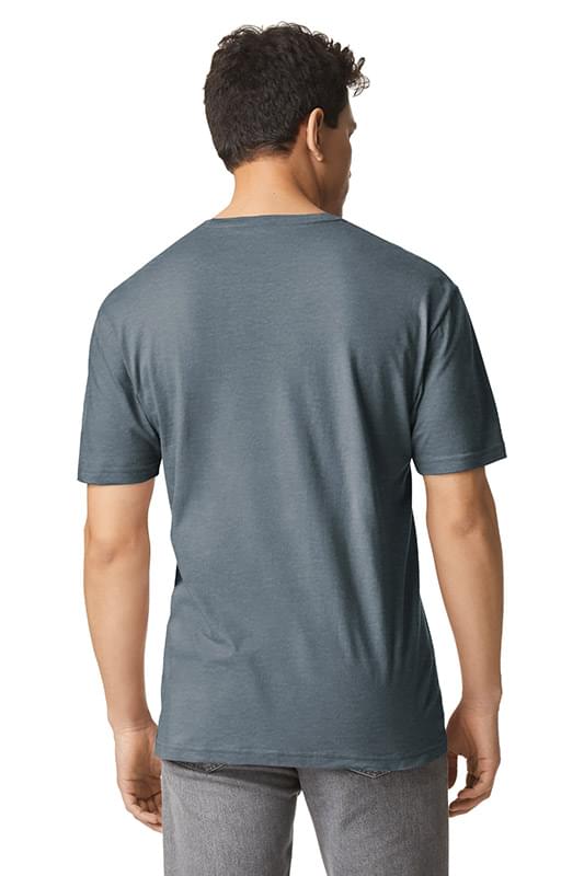 4.45-ounce, 100% US cotton 90/10 cotton/polyester (Sport Grey) 50/50 cotton/polyester (Heathers) Non-dyed fabric with visible specks of fibers and cotton seeds (Natural) Narrow width, rib collar Taped neck and shoulders Modern classic fit, seamless body Recycled, high-performing black tear-away label
