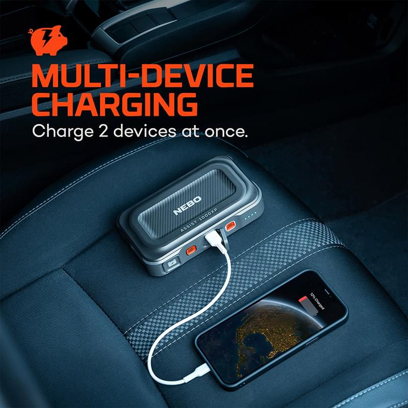 Take charge of roadside emergencies with the NEBO Assist™ 1000XP jump starter. With 1000 peak amps, you can confidently jump start any 12-volt car, motorcycle, or ATV battery.