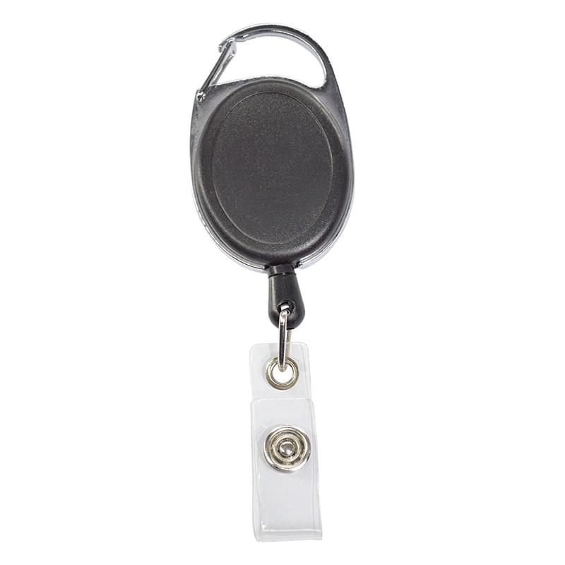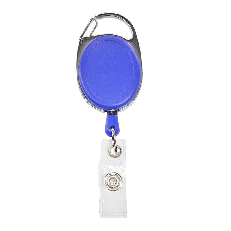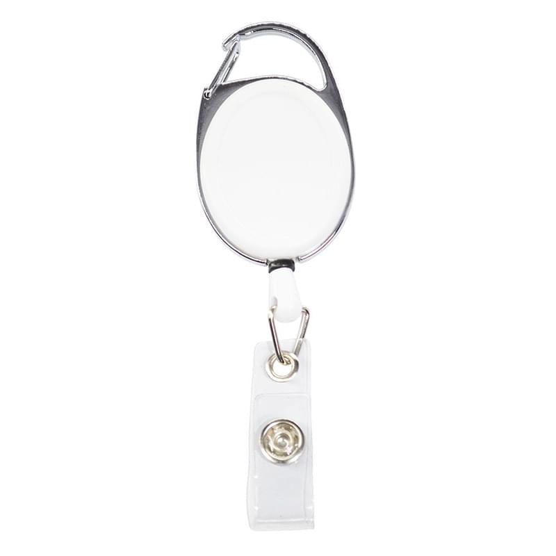 • Durable 30" nylon cord, 100k Pull • Large 1.2" Diameter Imprint Area • Durable Clear vinyl snapback strap • Polished stainless steel internal spring • Full color; UV or decal with epoxy dome • Sonic welded Front Concave plastic body Front Concave Surface Oval Carabiner Retractable Badge Reel with Plain Back and 1.4" round body with a 30" retractable nylon cord with chrome metal border, plastic adapter base and durable vinyl snapback strap. Optional full color decal sticker w/ epoxy dome or digital UV print. Available in a varitey of body colors to choose from and free PMS matched imprinting.