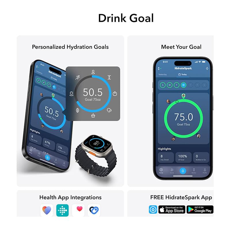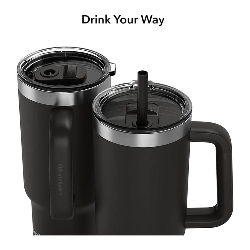 Sync your water intake with the HidrateSpark App via Bluetooth to monitor your progress, set personalized goals, and even locate your bottle using Apple’s Find My Network. The ergonomic handle and narrow base make it cup-holder friendly and easy to carry wherever you go. Choose your perfect drinking style with the versatile press-in lid featuring a secure straw seal or a drink opening, perfect for splash-free travel.