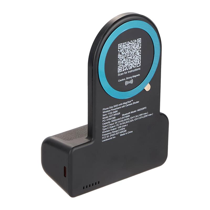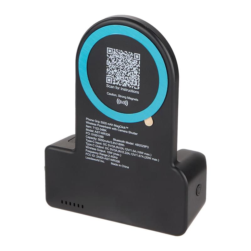 The Phone Grip 5,000 mAh MagClick™ Wireless Power Bank and Bluetooth® camera shutter contains a 5,000 mAh/18Wh rechargeable lithium battery that works as both a wireless charging power bank for a phone and a regular power bank. With Bluetooth® integrated into the powerbank, you can use the powerbank as a camera shutter. Attach your phone to the MagClick™ wireless charging pad, connect to Bluetooth, and press the camera shutter button on the powerbank to take a photo or video. If your phone doesn’t include Magsafe, don’t worry, we have included an adapter to keep your phone secure to the powerbank. The powerbank can also be used as a MagClick™ charging stand to capture videos, images, or keep the phone in sight on your desktop. The MagClick™ charging pad can reach a maximum output of 15W, while the Type-C Output can reach a maximum output of 20W. The powerbank can be charged through the Type-C Input. A Type C charging cable is included.
