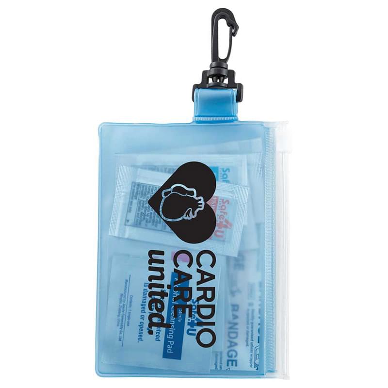 The On The Go 12-Piece First Aid Pack is a travel first-aid kit in a PVC pouch with a plastic zip closure and a plastic carabiner for convenient first aid travel care. The kit includes 4 adhesive bandages, 1 alcohol cleansing wipe, 1 antiseptic wipe and 1 insect sting relief wipe. Also includes SPF15 Lip Balm, First Aid Burn Cream, 1% Hydrocortisone Cream, Triple Antibiotic Ointment & Instant Hand Sanitizer in single-use packets. Meets FDA requirements. Available for shipment in contiguous United States. Air shipment to Alaska, Hawaii & Puerto Rico available with additional fee. See General Information page for additional air shipment charges. Not available for export.