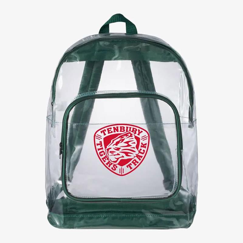 The Rally Clear Backpack has transparent material that makes this bag perfect for stadium, event, workplace and other safety purposes. The large zippered main compartment features a reinforced 210d bottom and a large gusseted zippered front pocket with a protective flap. Adjustable padded shoulder straps and a top carry handle make carrying convenient.