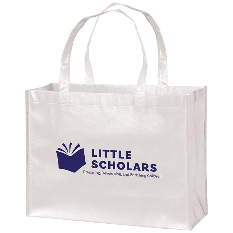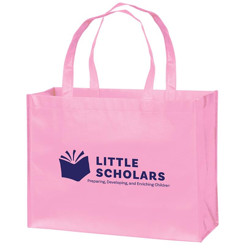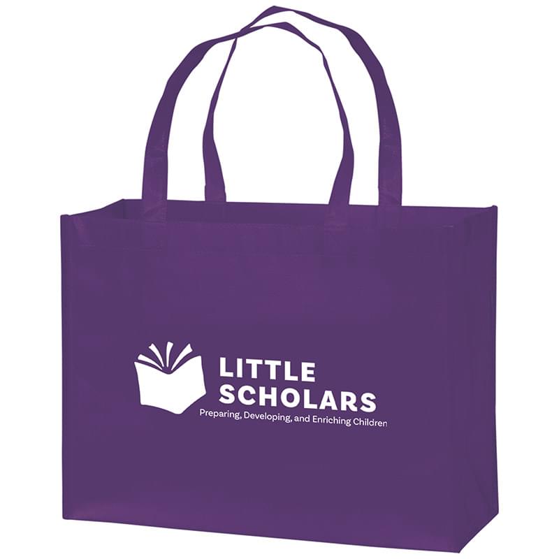 This durable grocery bag measures 16" x 12" and features 6" gussets with 22" handles. Crafted out of a non-woven, laminated polypropylene material that is easy to wipe clean while providing additional structure and strength. Designed to resist water, tears, and UV rays. Includes a high-gloss finish for a fashion-forward style. Available with a poly board insert. Customize with up to 2 spot colors on 1 side or 2 sides.