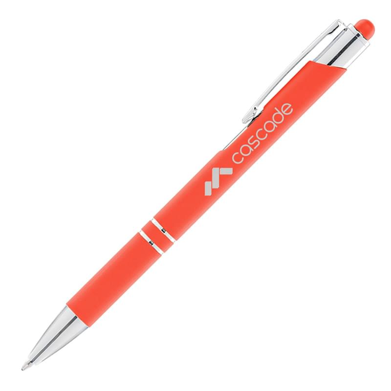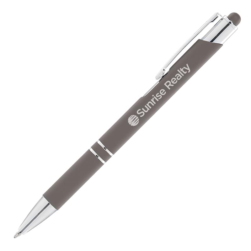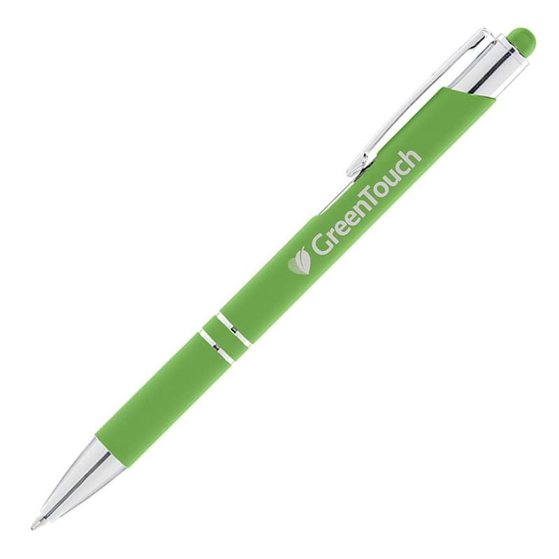Make a strong connection with new and potential clients using the Tres-Chic Softy Brights with Stylus Top! This medium ballpoint metal pen has a great selection of colors. It features a soft touch body, chrome trim with accent rings and your company's laser engraved imprint. Your tech customers will get a kick out of using this pen to write and then to navigate apps on their phones or other electronics that can be used with a stylus. Add some variation to your advertising campaign!