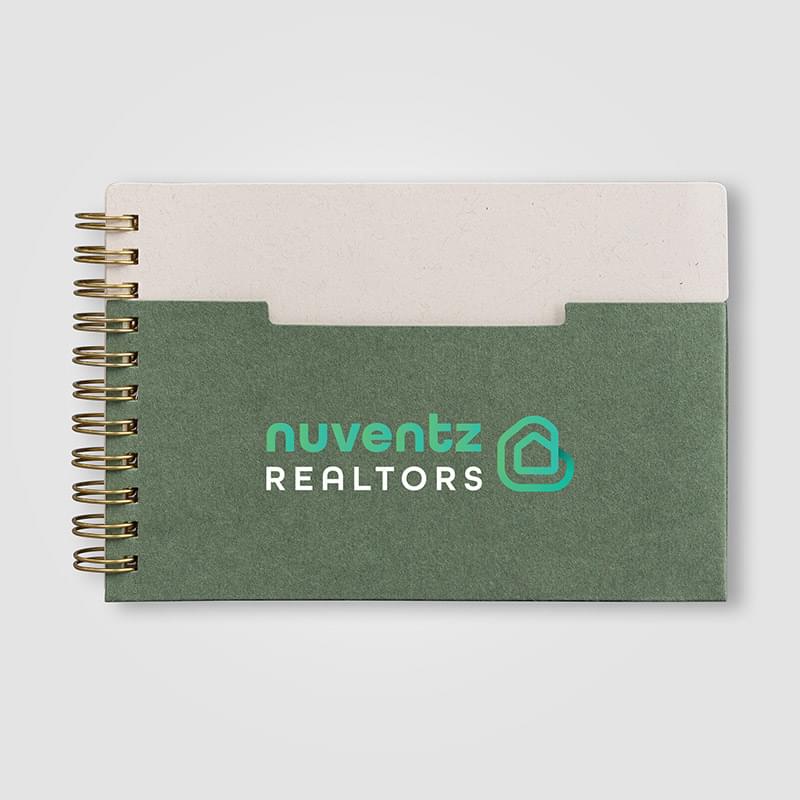 Front & Back Cover: Recycled Cotton Pocket (Exterior & Interior): Recycled Cotton Paper Binding: Steel with Brass Finish (Double Spiral) Inside Pages: FSC-Certified Lined Paper, 70 gsm Hangtag: FSC-Certified Paper