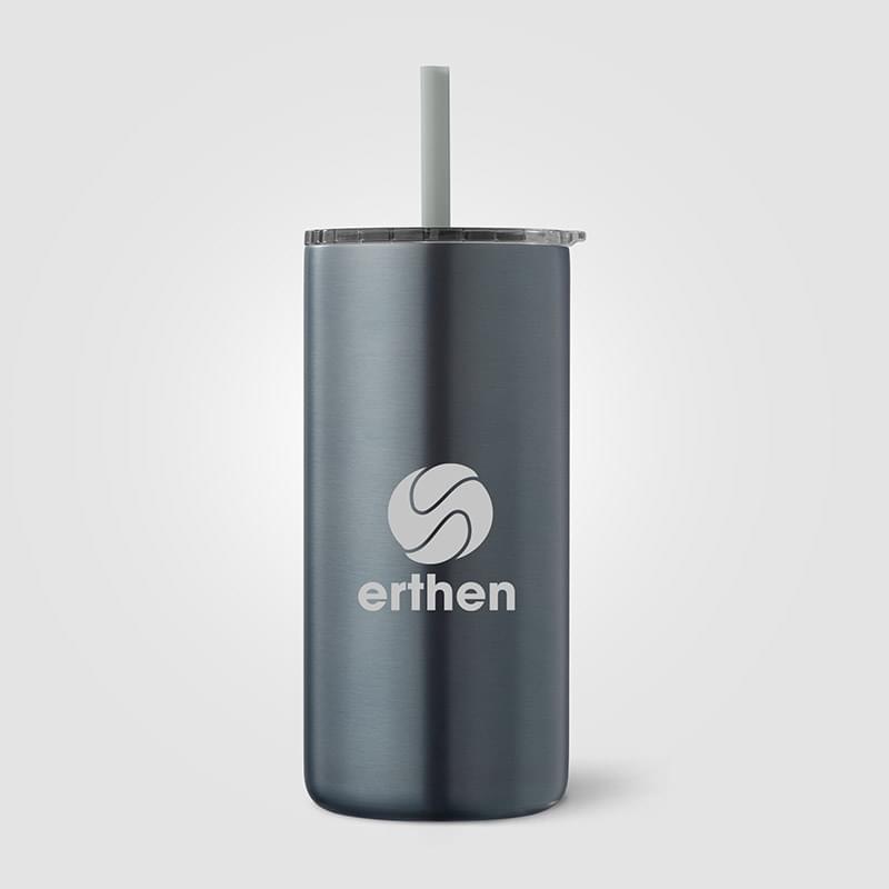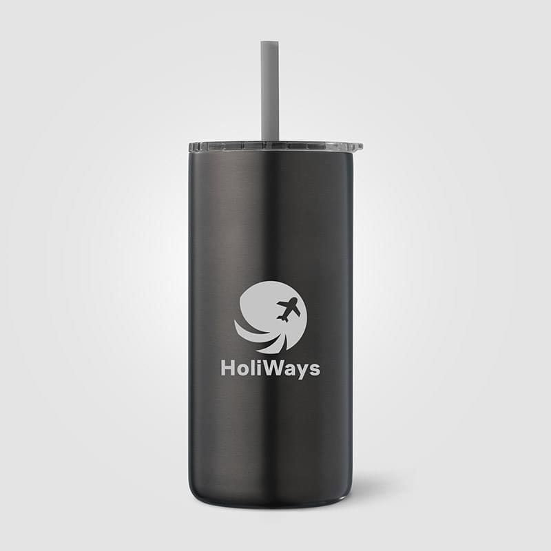 Double-wall tumbler with a straw, designed without a handle for a sleek appearance. Vacuum insulation ensures excellent temperature retention. Press-on lid with a spillproof design. Features a matte metallic painted finish for a stylish touch. Keeps drinks hot for up to 8 hours and cold for up to 10 hours.