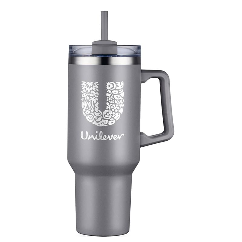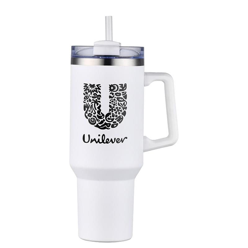 You can take this 40 oz. tumbler with you anywhere. This large travel mug made of stainless steel features double walled vacuum insulation and a solid ergonomic handle, allowing for fewer refills on the go. The sophisticated lid, which can be used by either left- or right-handed people, has a straw opening that is splash-proof thanks to a seal that keeps the straw in place. It fits in any standard cup holder with a 3 diameter bottom. You may use it at your desk, beside the pool, at the yoga studio, in the art studio, at home, or on the go! perfect for making a huge impact at any business function! You can put it to use in your automobile, lawn chair, exercise cycle, and so on. Drinks stay hot for up to 12 hours and cold for up to 30! It comes in a gift box and is available in powder coated finish: Black, Navy Blue, Gray and White. This product is free of BPA, phthalates, lead, and toxins. These are made of FDA-approved food-grade stainless steel and comply with California Proposition 65.