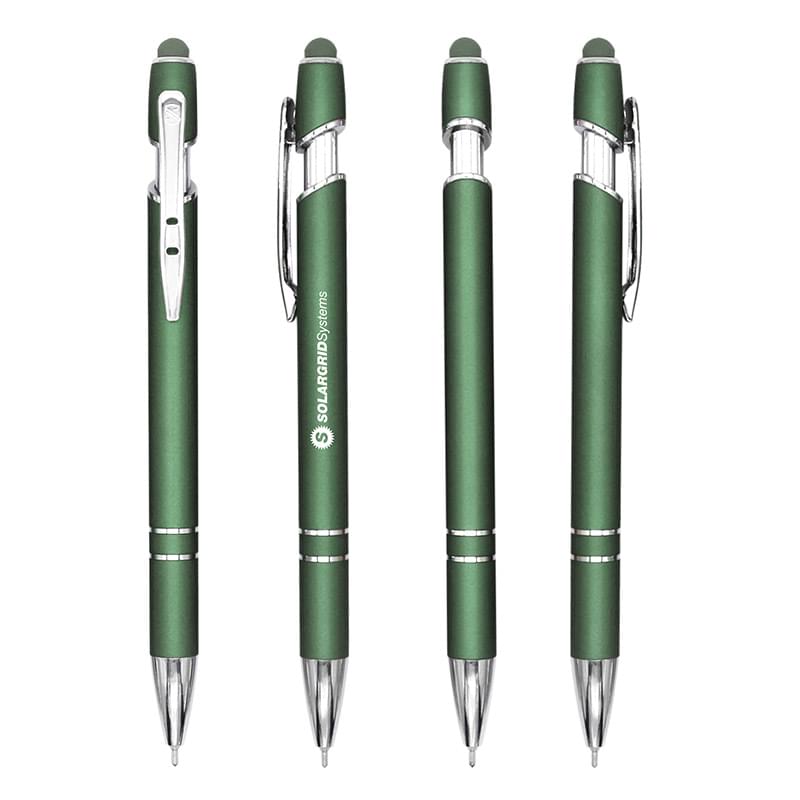 Our Best Selling Soft Touch Pen with Stylus and Gel-Glide™ Ink! Features our Softex™ Luster finish that provides a comfortable grip. Featuring your choice of mess free, smudge proof, black Gel-Glide™ Ink. Double decorative bands and screen printed imprint. Touchscreen stylus on the end of the pen. Your custom message printed directly on the soft touch rubberized pen barrel. FOB Texas 78045.